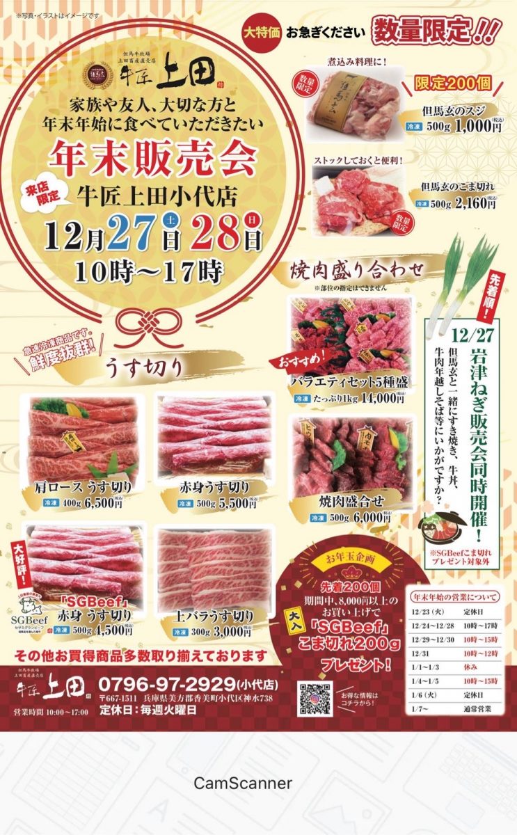 P 2025年12月27日 , by gyusho K お知らせ 牛匠上田小代店販売会 雪のある12/27となりました。 足元お気をつけてお越しください。 お店のすぐそばにお車をお停めいただけます。 世界農業遺産の地で美味しい但馬玄をお求めください。 また日本農業遺産の「岩津ねぎ」の販売も行います。 もうこれは、但馬玄✖️岩津ねぎのすき焼きか!但馬玄ステーキに岩津ねぎグリルの付け合わせか!メニューは広がりますね! 美味しい但馬玄をお届けします。 #但馬玄 #牛匠上田 #上田畜産 #お届けしたいのは本物です #世界農業遺産