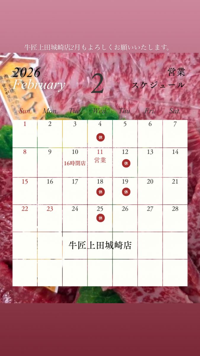 2月になりました。 P 2026年2月1日 , by gyusho K お知らせ あっという間に2月です。 水曜日定休の牛匠上田城崎店ですが、11日(水)は営業します。 美味しい但馬玄をお届けします。 2月もよろしくお願いいたします🙇♀️ #但馬玄 #牛匠上田城崎店 #上田畜産 #お届けしたいのは本物です
